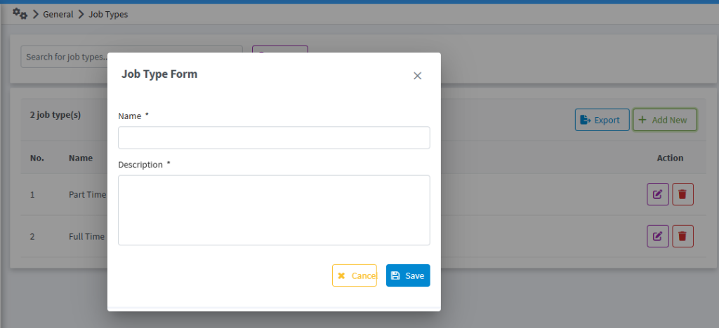 Under HR Admin Setup, click on general, then click on job Types. To add a job type, click “Add New”, a dialog is displayed.
