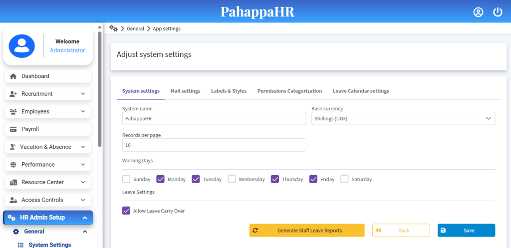 A page is displayed where a user is required to input the system name, records per page, select the system base currency, records per page, working day and allowing leave carry