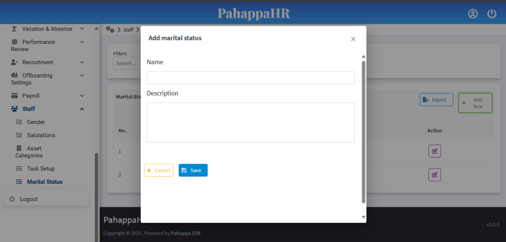This feature allows creation of marital status options in the system. To add a marital status option, click on “Add New”, a dialog is created, fill in the “name”, and “description” which is an option and save.
