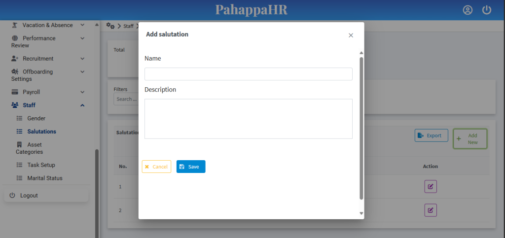 This feature allows creating of the salutations into the system. To create a salutation, click on “Add New”, a dialog is created, fill in the “name”, and “description” which is an option and save.