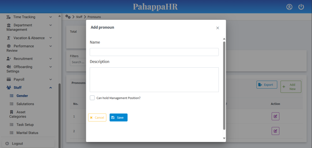 This feature is for creating genders in the system. To add one, click on “Add New”, a dialog is created, fill in the “name”, and “description” which is an option and save.