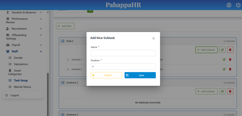 This feature allows setting up of tasks in the system. Tasks can either be onboarding tasks or offboarding tasks. To create a task, click on “Add New”, a dialog is created, fill in the “task name”, “position” in regards to order of appearance in the tasks list, select the type of tasks it belongs to and specify if the task has sub-tasks or not and save.